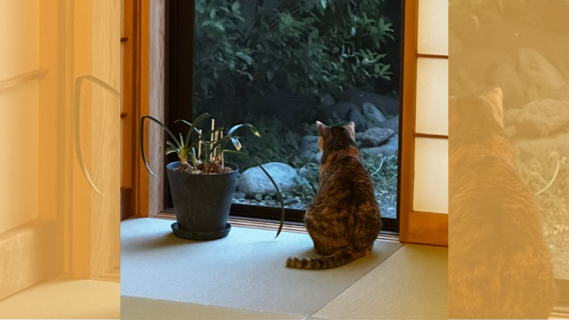 万年青と一緒に庭を眺める、りん(後ろ姿)。