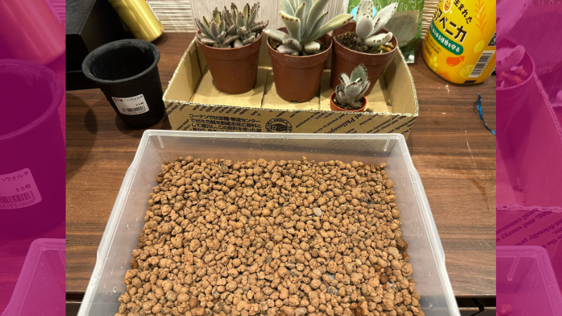 浮かせとくと良い、というので、プラケースにハイドロコーン敷き詰めて通気させることに。