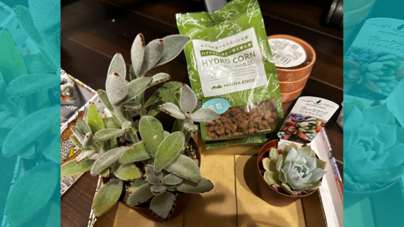 昨晩~朝の思い付きを実現するため、3号サイズの何らかの鉢(素焼きφ8cm3個セット100円@DAISO)とハイドロコーンを買いに行っただけのはずが、気付いたら5号鉢の月兎耳とエケベリア・”ブルークラウド”を一緒に購入していました。
